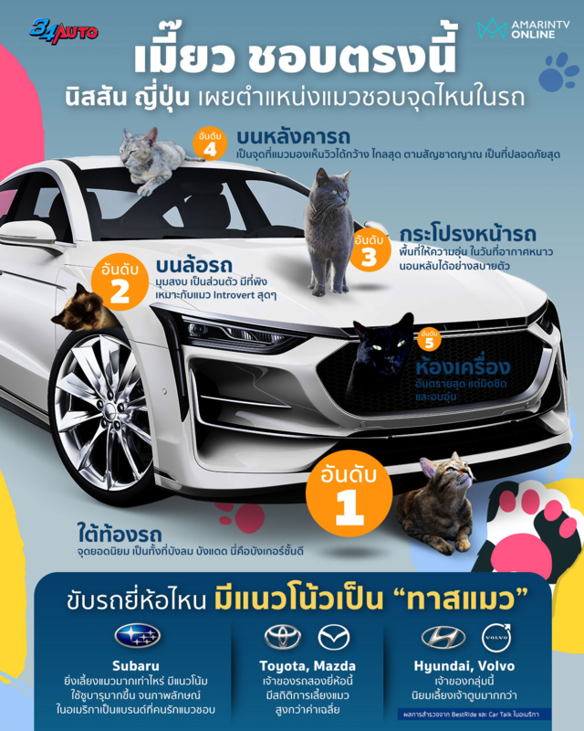 นิสสัน มอเตอร์ ประเทศญี่ปุ่น เคยทำการสำรวจและแชร์สถิติตำแหน่งที่แมวมักเข้าไปติดหรือแอบซ่อนตัวในรถมากที่สุด 5 อันดับ ดังนี้