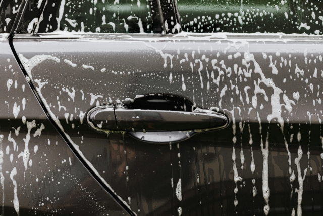 เริ่มจากการฉีดน้ำไล่จาก บนลงล่าง การใช้แรงดันน้ำจะช่วยชะล้างฝุ่น PM 2.5 และเม็ดทรายที่เกาะอยู่ออกไปก่อน หากคุณข้ามขั้นตอนนี้แล้วเอาถุงมือไปถูเลย เม็ดทรายเหล่านั้นจะทำหน้าที่เหมือนกระดาษทรายเบอร์ละเอียด ขัดรถจนเกิดรอยขนแมวทันที
