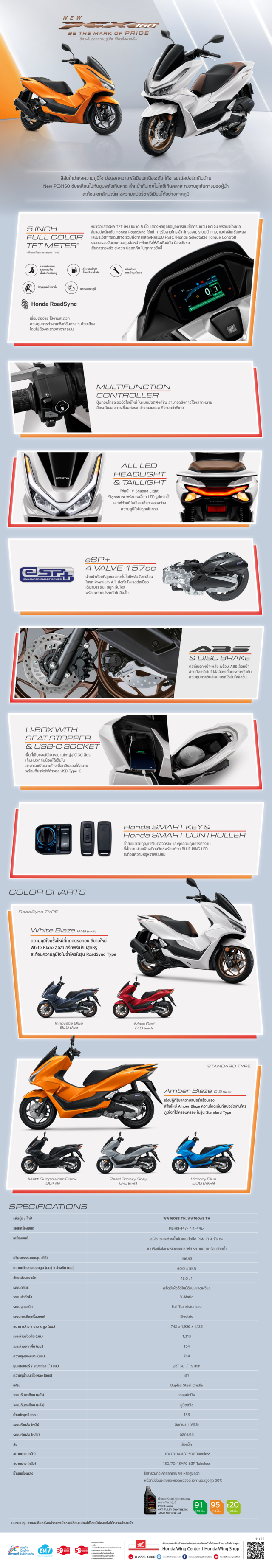 New Honda PCX160 สองสีใหม่จากไทยฮอนด้า ได้รับการเปิดตัวภายใต้คอนเซปต์ “BE THE MARK OF PRIDE อีกระดับของความภูมิใจ ที่ใครก็อยากเป็น” ซึ่งเป็นการตอกย้ำถึงเอกลักษณ์ของรถจักรยานยนต์สปอร์ตพรีเมียมที่ผสานดีไซน์อันโดดเด่นและเทคโนโลยีล้ำสมัยเพื่อตอบโจทย์การใช้งานที่หลากหลายและสไตล์ของคนรุ่นใหม่ ด้วยการออกแบบไฟหน้าทรง Victory Shape และไฟ LED รอบคัน ตัวรถได้ถูกเสริมลุคให้ดูสปอร์ตและมีสีสันเทรนดี้ยิ่งขึ้น