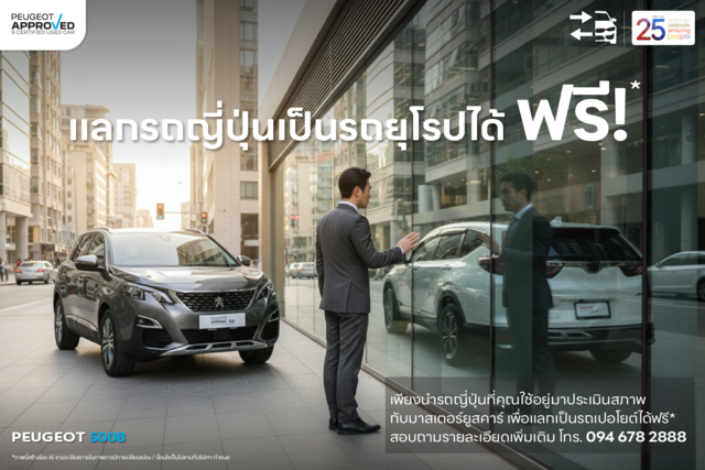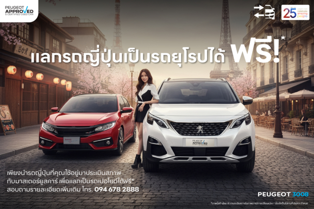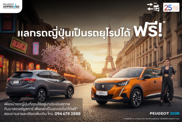 มาสเตอร์ เซอร์ทิฟายด์ ยูสคาร์ ศูนย์รวมรถยนต์มือสองครบวงจร ภายใต้บริษัท มิลเลนเนียม กรุ๊ป คอร์ปอเรชั่น (เอเชีย) จำกัด (มหาชน) สร้างปรากฏการณ์ใหม่ในวงการรถมือสอง ด้วยการเปิดตัวแคมเปญสุดเร้าใจที่เปิดโอกาสให้เจ้าของรถยนต์ญี่ปุ่นสามารถยกระดับสู่ประสบการณ์พรีเมียมสไตล์ฝรั่งเศส โดยการแลกเปลี่ยนรถคันเดิมเป็นรถยุโรปมือสอง PEUGEOT APPROVED & CERTIFIED USED CAR โดยอาจไม่ต้องจ่ายเพิ่ม ตามคอนเซ็ปต์ ‘แลกรถญี่ปุ่นเป็นรถยุโรปได้ ฟรี!’ แคมเปญนี้มีผลตั้งแต่วันนี้ จนถึงสิ้นเดือน พฤศจิกายน 2568 (จำนวนจำกัด)