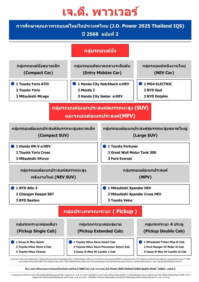 J.D. Power ได้เปิดเผยผลการศึกษาคุณภาพรถยนต์ใหม่ในประเทศไทย ประจำปี 2568 (2025 Thailand Initial Quality StudySM - IQS) โดยทำการสำรวจเจ้าของรถใหม่ 4,832 ราย ที่ซื้อรถระหว่างเดือนมกราคมถึงกันยายน 2568 ครอบคลุมรถยนต์ 57 รุ่น จาก 15 แบรนด์ เพื่อจัดอันดับคุณภาพจากจำนวนปัญหาต่อรถยนต์ 100 คัน (PP100) ซึ่งคะแนนที่น้อยกว่าหมายถึงคุณภาพที่ดีกว่า