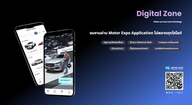 ยิ่งกว่านั้น สามารถชมงานผ่าน MOTOR EXPO APPLICATION อัดแน่นข้อมูลของงาน ทั้งรีวิวรถยนต์ รถจักรยานยนต์ จาก Influencer ชื่อดัง พร้อมฟีเจอร์ให้ใช้งานหลากหลาย อาทิ ข้อมูลเปรียบเทียบคันต่อคัน โปรโมชั่น แคมเปญพิเศษ ช่วยในการเลือกซื้อรถยนต์ รถจักรยานยนต์ ดาวน์โหลดโบรชัวร์ จำหน่ายบัตรชมงานทั่วไป และบัตรชมงานแบบวีไอพี MOTOR EXPO EXCLUSIVE VISITOR ฯลฯ
