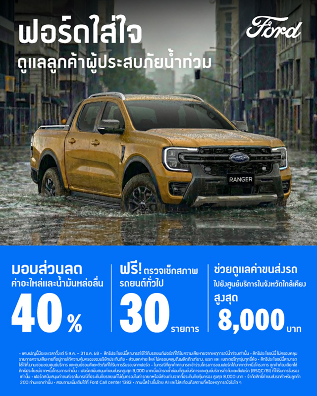 ฟอร์ด ประเทศไทย ช่วยเหลือลูกค้าผู้ประสบภัยน้ำท่วม ด้วยการให้ส่วนลดงานซ่อมสูงสุดถึง 40%* ค่าขนส่งรถไปยังศูนย์บริการในพื้นที่ใกล้เคียงสูงสุด 8,000 บาท** พร้อมบริการตรวจสภาพรถยนต์ทั่วไปฟรี 30 รายการ ตั้งแต่วันนี้จนถึงวันที่ 31 ธันวาคม 2568