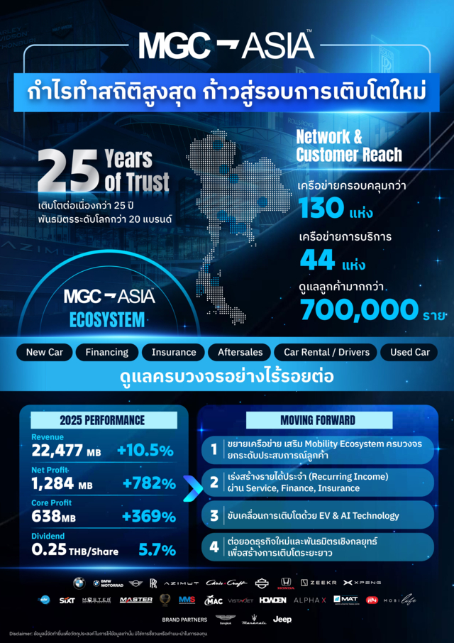 MGC-ASIA หรือ บริษัท มิลเลนเนียม กรุ๊ป คอร์ปอเรชั่น (เอเชีย) จำกัด (มหาชน) ประกาศความสำเร็จปี 2568 ด้วยการสร้างสถิติ กำไรสูงสุดเป็นประวัติการณ์ ผลักดันโดยระบบนิเวศทางธุรกิจที่แข็งแกร่งและการปรับตัวเข้าสู่ยุคยานยนต์ไฟฟ้า (EV) อย่างเต็มตัว