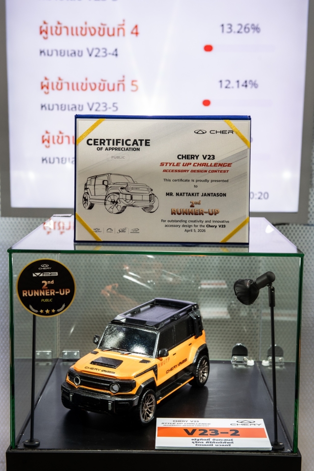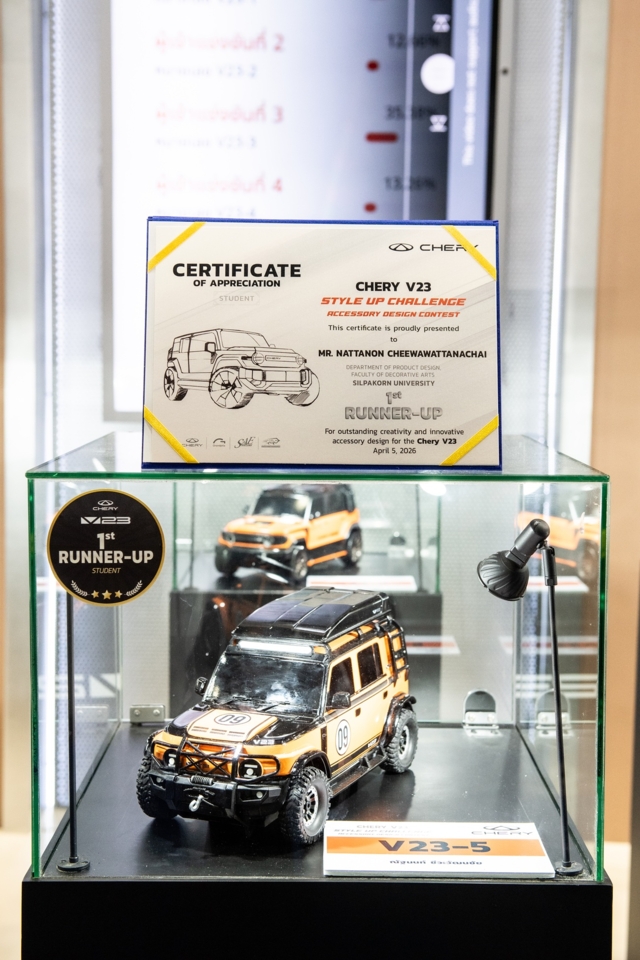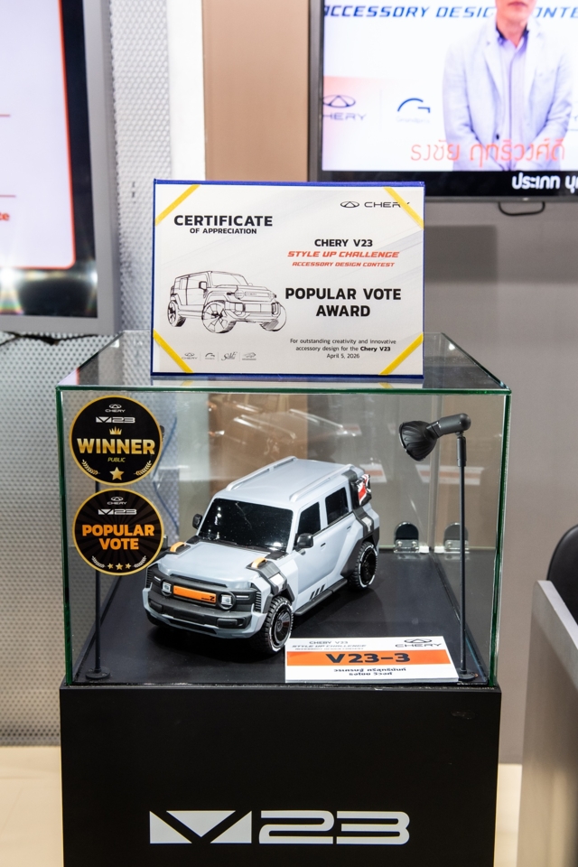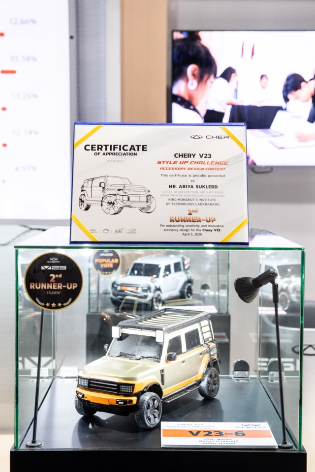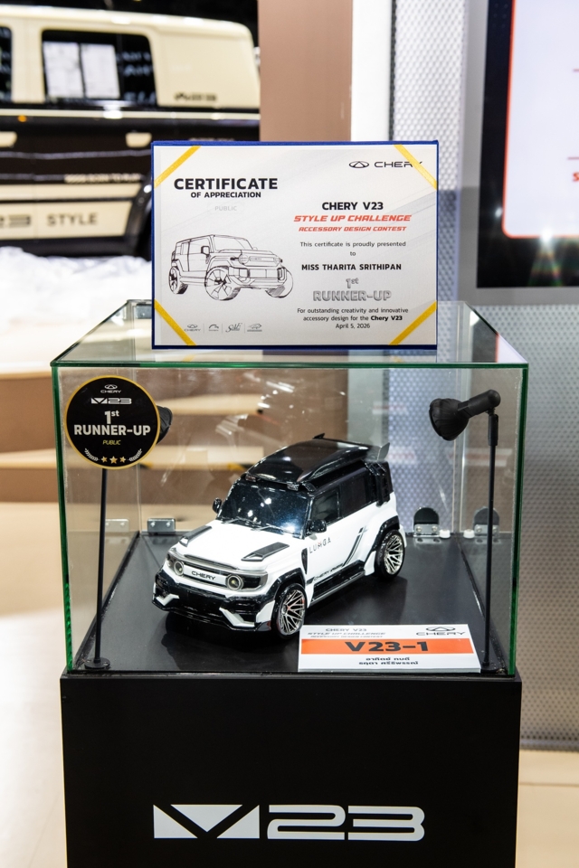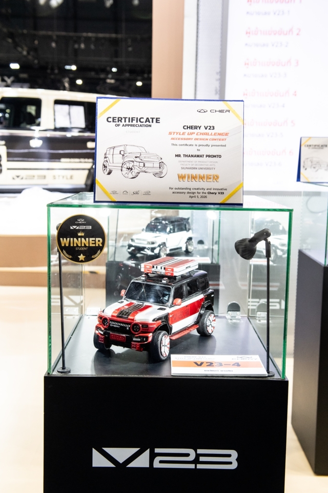 เชอรี ประเทศไทย ร่วมกับพันธมิตรยักษ์ใหญ่อย่างสมาคมวิศวกรรมยานยนต์ไทย บมจ.กรังด์ปรีซ์ฯ และสรยท. จัดพิธีมอบรางวัลโครงการประกวดออกแบบอุปกรณ์ตกแต่งรถยนต์ Chery V23 Style Up Challenge อย่างเป็นทางการภายในงานบางกอก อินเตอร์เนชั่นแนล มอเตอร์โชว์ ครั้งที่ 47 ณ อิมแพ็ค เมืองทองธานี เมื่อวันที่ 5 เมษายน 2569 เพื่อสนับสนุนให้คนรุ่นใหม่และประชาชนทั่วไปได้แสดงศักยภาพในการตีความเอกลักษณ์รถยนต์ทรงกล่องผ่านความคิดสร้างสรรค์ที่ใช้งานได้จริง พร้อมโอกาสต่อยอดสู่การทำงานในระดับโลก