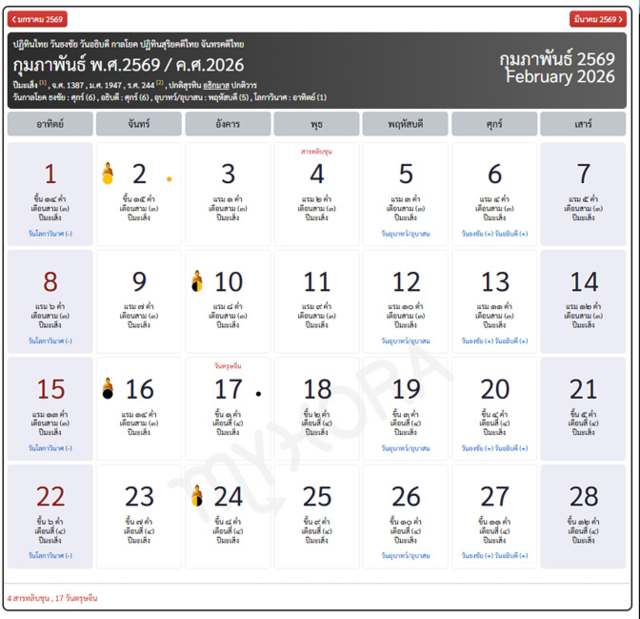 เปิดปฏิทินวันพระเดือนกุมภาพันธ์ 2569 วันพระกุมภาพันธ์ 2569 เตรียมตัวไปทำบุญ รักษาศีล