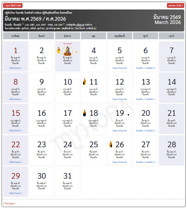 • วันอังคารที่ 3 มีนาคม 2569 ขึ้น ๑๕ ค่ำ เดือนสี่(๔) ปีมะเส็ง (วันมาฆบูชา)