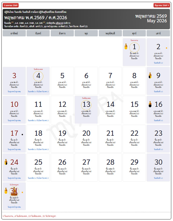 • วันศุกร์ที่ 1 พฤษภาคม 2569 ขึ้น ๑๕ ค่ำ เดือนหก(๖) ปีมะเมีย (วันแรงงาน)