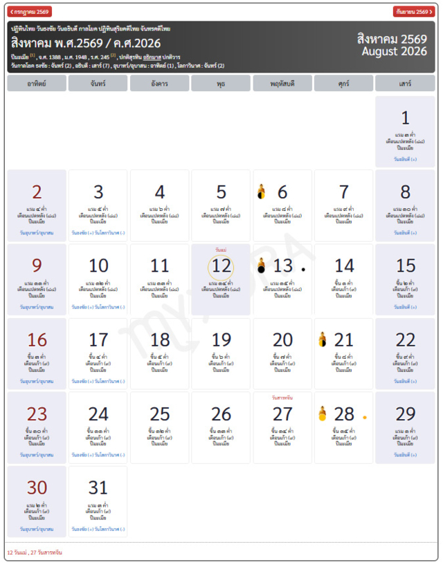• วันพฤหัสบดีที่ 6 สิงหาคม 2569 แรม ๘ ค่ำ เดือนแปดหลัง(๘๘) ปีมะเมีย