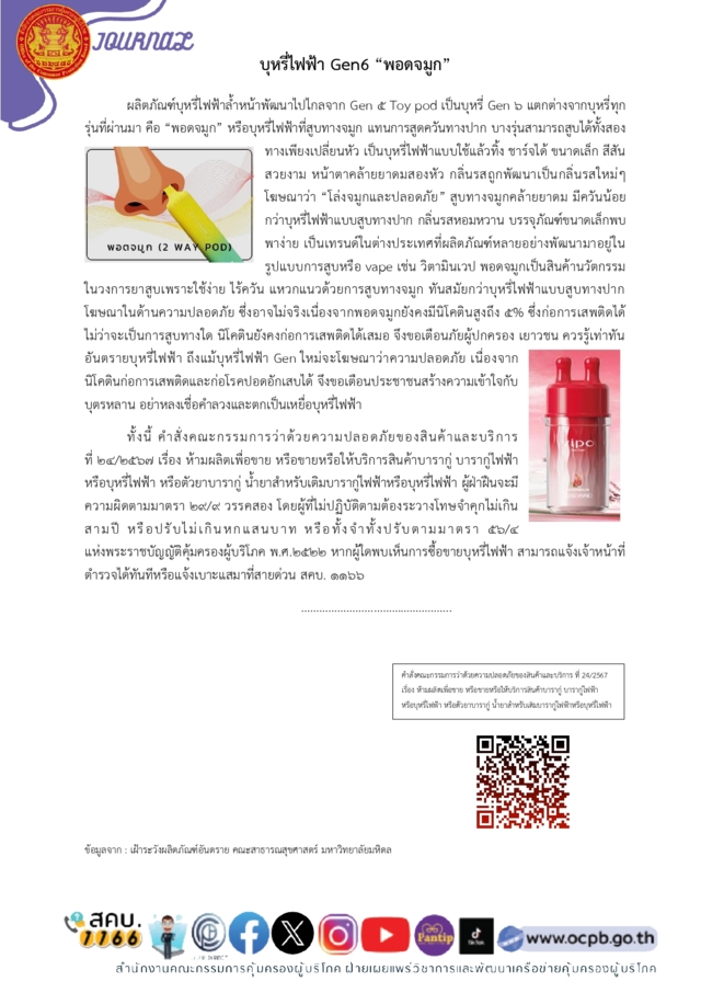 อ้างอิงข้อมูล : บุหรี่ไฟฟ้า Gen6 “พอดจมูก”/ เทศบาลเมืองตะลุบัน จังหวัดปัตตานี/ เฝ้าระวังผลิตภัณฑ์อันตราย คณะสาธารณสุขศาสตร์ มหาวิทยาลัยมหิดล