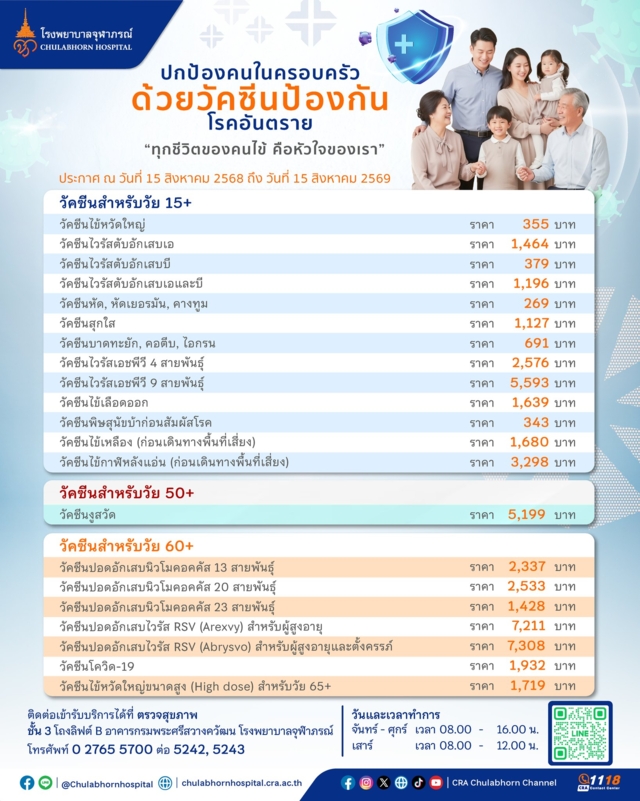 โรงพยาบาลจุฬาภรณ์ ราชวิทยาลัยจุฬาภรณ์ ขอเชิญประชาชนทุกเพศทุกวัยร่วมป้องกันตนเองและคนที่คุณรัก ด้วยการเข้ารับ “วัคซีนทางเลือก” เพื่อเสริมสร้างภูมิคุ้มกันและลดความเสี่ยงจากโรคอันตรายที่อาจเกิดขึ้นได้ในทุกช่วงวัย เพราะทุกชีวิตของคนไข้คือหัวใจของเรา