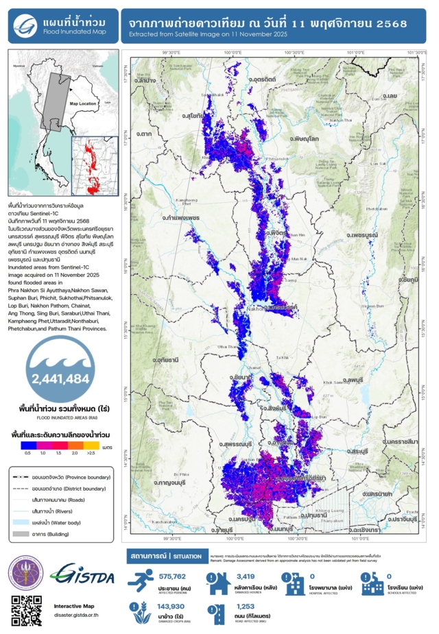 GISTDA เปิดข้อมูลล่าสุดจากดาวเทียม Sentinel-1C พบพื้นที่น้ำท่วมขังในพื้นที่ลุ่มและที่อยู่อาศัยบริเวณบางส่วนของ 17 จังหวัดภาคกลาง ได้แก่ พระนครศรีอยุธยา นครสวรรค์ สุพรรณบุรี พิจิตร สุโขทัย พิษณุโลก ลพบุรี นครปฐม ชัยนาท อ่างทอง สิงห์บุรี อุทัยธานี กำแพงเพชร อุตรดิตถ์ นนทบุรี เพชรบูรณ์ และปทุมธานี โดยแต่ละพื้นที่พบระดับความลึกของน้ำท่วมขังไม่น้อยกว่า 50 เซนติเมตร โดยเฉพาะพื้นที่ที่ได้รับผลกระทบจากน้ำท่วม อาจเสี่ยงต่อโรคและภัยสุขภาพที่มากับน้ำท่วมได้