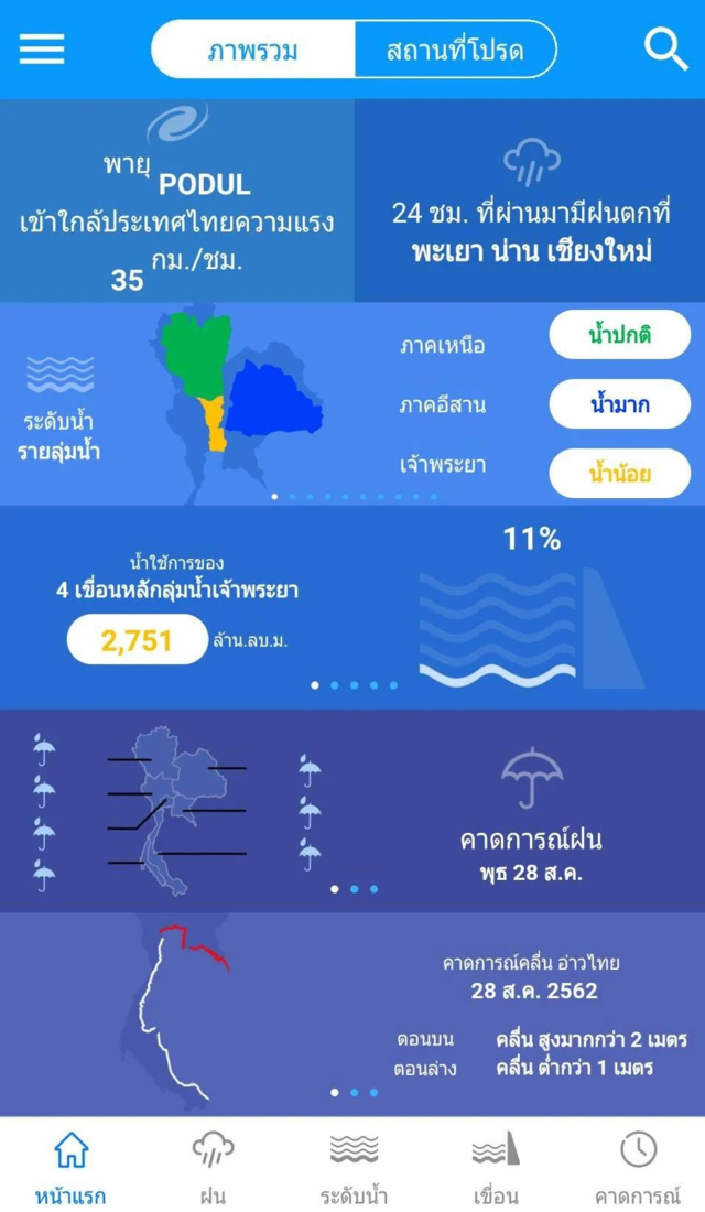 ThaiWater หน่วยงานพัฒนา : สถาบันสารสนเทศทรัพยากรน้ำ (องค์การมหาชน) - สสน. ศูนย์รวมข้อมูลสถานการณ์น้ำครบวงจร ครอบคลุมปริมาณฝนตก ระดับน้ำในลุ่มน้ำ ปริมาณน้ำในเขื่อน ข้อมูลพายุ คาดการณ์สภาพอากาศล่วงหน้า | Windy แผนที่พยากรณ์อากาศระดับโลกที่มีความละเอียดสูง สามารถดูข้อมูลได้หลากหลาย เช่น ทิศทาง/ความเร็วลม อุณหภูมิ ฝน เมฆ คลื่น และเส้นทางพายุ เหมาะสำหรับการดูภาพรวมของพายุและลมฟ้าอากาศ
