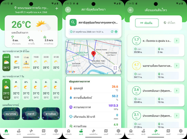 Thai Weather หรือ TMD พยากรณ์ หน่วยงานพัฒนา : กรมอุตุนิยมวิทยา ติดตามสภาพอากาศและพายุโดยเฉพาะ รายงานสภาพอากาศปัจจุบันและล่วงหน้า เส้นทางพายุ แผ่นดินไหว เรดาร์สภาพอากาศ ภาพถ่ายดาวเทียม การแจ้งเตือนสภาพอากาศรุนแรง | Rain Viewer แผนที่เรดาร์ฝน เน้นข้อมูลเรดาร์ฝนแบบเรียลไทม์ทั่วโลก และคาดการณ์การเคลื่อนที่ของฝนล่วงหน้าได้ โดยให้ข้อมูลที่แม่นยำและรวดเร็วจากการประมวลผลข้อมูลเรดาร์ดิบโดยตรง