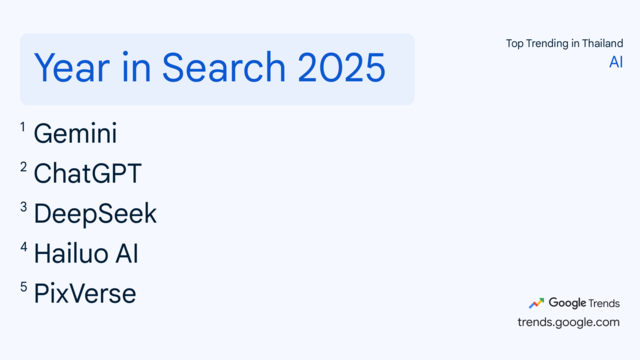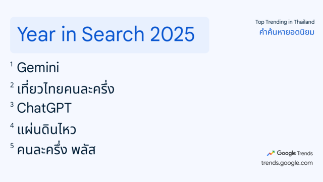 1. Gemini 2. เที่ยวไทยคนละครึ่ง 3. ChatGPT 4. แผ่นดินไหว 5. คนละครึ่ง พลัส 6. สงคราม ส่งด่วน 7. กุญแจกลางใจ 8. iPhone 17 9. DeepSeek 10. คุณพี่เจ้าขาดิฉันเป็นห่านมิใช่หงส์