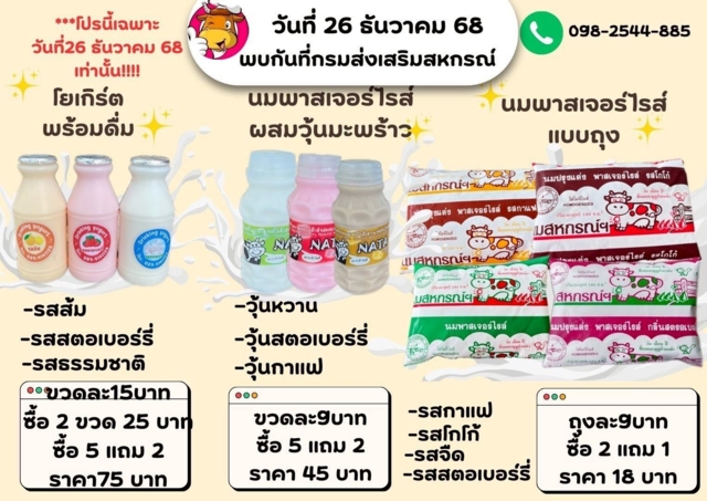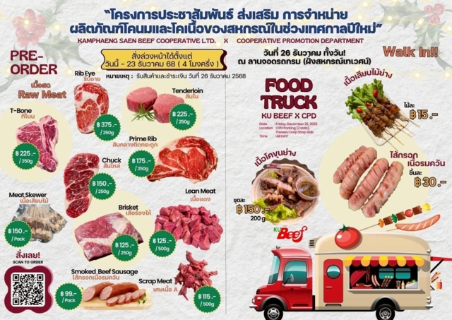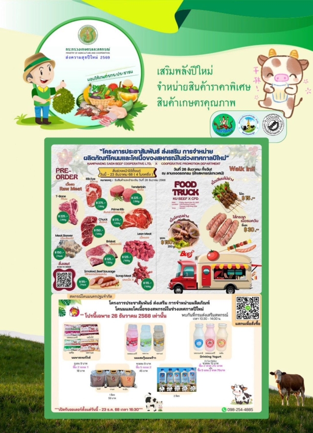 กรมส่งเสริมสหกรณ์ โดยกองพัฒนาสหกรณ์ภาคการเกษตรและกลุ่มเกษตรกร นำผลิตภัณฑ์โคนมและโคเนื้อคุณภาพจากสหกรณ์ อาทิ นมพาสเจอร์ไรส์ นมผสมวุ้นมะพร้าว โยเกิร์ตพร้อมดื่ม จากสหกรณ์โคนมนครปฐม จำกัด และผลิตภัณฑ์โคเนื้อจากสหกรณ์โคเนื้อกำแพงแสน จำกัด โดยมีไฮไลท์คือ Food Truck KU BEEF X CPD มาจำหน่ายเนื้อโคขุนย่างเนื้อเสียบไม้ย่าง ไส้กรอกเนื้อรมควัน และเนื้อโคคุณภาพเกรดพรีเมี่ยมในราคาพิเศษ ในวันศุกร์ที่ 26 ธันวาคม 2568 ณ กรมส่งเสริมสหกรณ์ เทเวศร์ กรุงเทพฯ