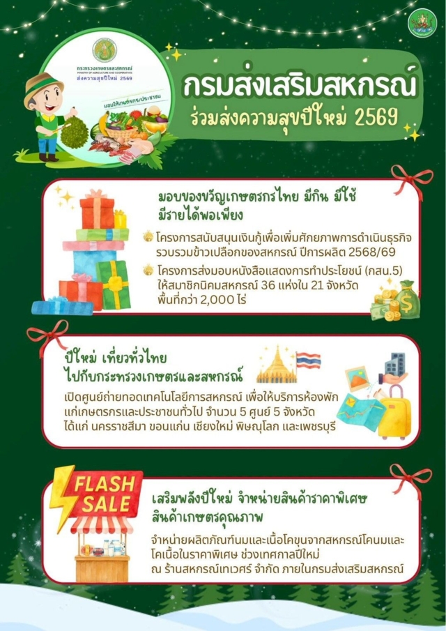 กรมส่งเสริมสหกรณ์เปิดพื้นที่ศูนย์ถ่ายทอดเทคโนโลยีการสหกรณ์เพื่อให้บริการห้องพักราคาประหยัด แก่สมาชิกสหกรณ์ กลุ่มเกษตรกร และประชาชนทั่วไป ในช่วงเทศกาลปีใหม่ จำนวน 5 แห่ง ใน 5 จังหวัดท่องเที่ยว ได้แก่ ศูนย์ถ่ายทอดเทคโนโลยีการสหกรณ์ที่ 5 อำเภอเมืองนครราชสีมา จังหวัดนครราชสีมา ศูนย์ถ่ายทอดเทคโนโลยีการสหกรณ์ที่ 7 อำเภอเมืองขอนแก่น จังหวัดขอนแก่น ศูนย์ถ่ายทอดเทคโนโลยีการสหกรณ์ที่ 9 อำเภอสันทราย จังหวัดเชียงใหม่ ศูนย์ถ่ายทอดเทคโนโลยีการสหกรณ์ที่ 11 อำเภอวังทอง จังหวัดพิษณุโลก และศูนย์ถ่ายทอดเทคโนโลยีการสหกรณ์ที่ 15 อำเภอชะอำ จังหวัดเพชรบุรี ในราคา 150 บาทต่อคนต่อคืน เปิดให้เข้าพักระหว่างวันที่ 30 ธันวาคม 2568 – 2 มกราคม 2569 เพื่อเป็นอีกหนึ่งทางเลือกในการท่องเที่ยวพักผ่อนอย่างประหยัดและอบอุ่นในช่วงเทศกาลแห่งความสุข