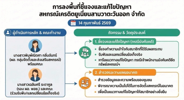 ต่อมาวันที่ 12 ก.พ. 2569 ทางสำนักงานส่งเสริมสหกรณ์กรุงเทพฯ พื้นที่ 2 ลงพื้นที่อีกครั้งเพื่อทำความเข้าใจกับสมาชิกที่ได้รับความเดือดร้อน และผู้นำชุมชนถึงแนวทางดังกล่าว ล่าสุดวันที่ 14 ก.พ. 2569 นางสาวกมลวรรณ นุชัย ผู้อำนวยการสำนักงานส่งเสริมสหกรณ์กรุงเทพมหานครพื้นที่ 2 ได้มอบหมายให้ นางสาวพิมพ์ณิตศา กลิ่นจันทร์ ผู้อำนวยการกลุ่มจัดตั้งและส่งเสริมสหกรณ์ สำนักงานส่งเสริมสหกรณ์กรุงเทพมหานครพื้นที่ 2 พร้อมคณะร่วมกับเจ้าหน้าที่สถาบันพัฒนาองค์ชุมชน นำโดยนางสาวเฉลิมศรี ระดากูล รองผู้อำนวยการสถาบันฯ ลงพื้นที่ตรวจสอบทรัพย์สินและผังที่ดิน จำนวน 205 แปลงที่มีปัญหา พร้อมชี้แจงทำความเข้าใจหาทางออกร่วมกับผู้นำชุมชนและสมาชิกสหกรณ์ฯที่ได้รับความเดือดร้อน กรณีเจ้าพนักงานบังคับคดีออกหมายออกหมายบังคับคดียึดทรัพย์ของสหกรณ์ฯ