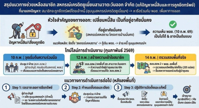 จากนั้นวันที่ 10 ก.พ. 2569 ได้มีการร่วมประชุม 4 ฝ่าย ระหว่างกรมส่งเสริมสหกรณ์ โดยสำนักงานส่งเสริมสหกรณ์กรุงเทพฯพื้นที่ 2 สถาบันพัฒนาองค์ชุมชนหรือพอช.(องค์การมหาชน) และสมาชิกสหกรณ์ฯที่ได้รับความเดือดร้อนเพื่อหาทางออกร่วมกัน โดยสำนักงานส่งเสริมสหกรณ์กรุงเทพฯ พื้นที่2 เสนอแนวทางให้มีการจดทะเบียนจัดตั้งสหกรณ์บริการ ประเภทเคหสถาน ภายใต้โครงการบ้านมั่นคง