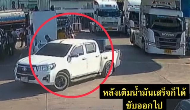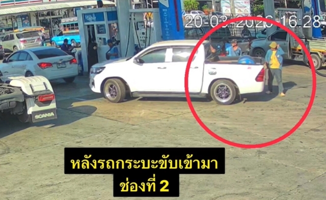 จากการสอบถามพี่หมวยผจก.ปั้มน้ำมันได้เล่าว่า ตอนนั้นหลังเติมน้ำมันใส่ถังน้ำมันลิตรเสร็จ น้องพนักงานปั๊มที่เป็นผู้หญิงก็ได้ถามคนขับรถกระบะ ว่าจ่ายเงินยังไงดีคะคนขับรถกระบะได้บอกว่า "เก็บคันข้างหน้าเลยครับ" ส่วนรถกระบะก็ได้ขับรถออกไปเลย ทีนี่น้องก็ได้ไปเติมน้ำมันรถยนต์เก๋ง ที่ขับตามท้ายเข้ามาแล้วก็บอกกับทางคนขับรถยนต์และทางคนขับก็บอกว่า"ไม่รู้เรื่องไม่รู้จักกับรถกระบะคันดังกล่าว"