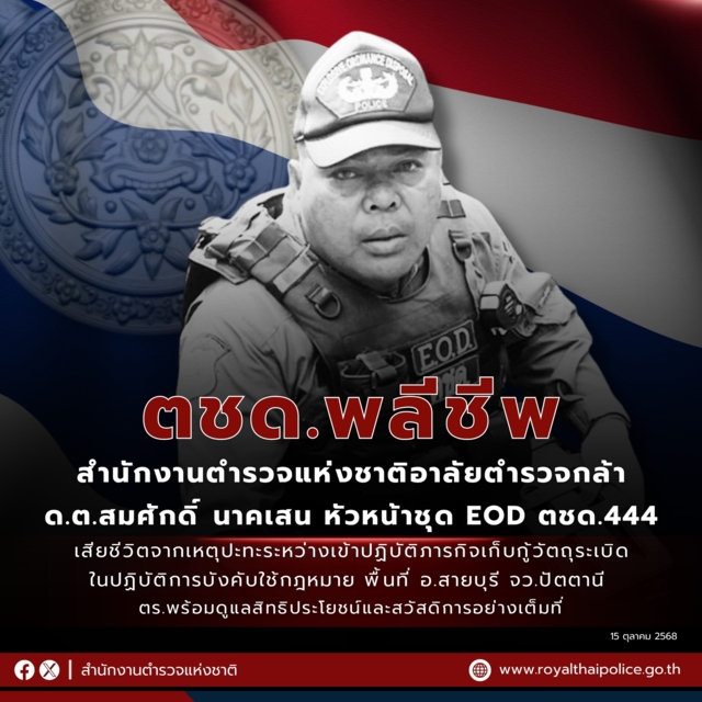 สำนักงานตำรวจแห่งชาติขอแสดงความเสียใจอย่างสุดซึ้งต่อครอบครัวของ ด.ต.สมศักดิ์ นาคเสน หัวหน้าชุด EOD ตชด.444 เสียชีวิตจากเหตุปะทะระหว่างเข้าปฏิบัติภารกิจเก็บกู้วัตถุระเบิด ในปฏิบัติการบังคับใช้กฎหมาย พื้นที่ อ.สายบุรี จ.ปัตตานี เมื่อวันที่ 15 ตุลาคม 2568