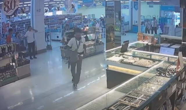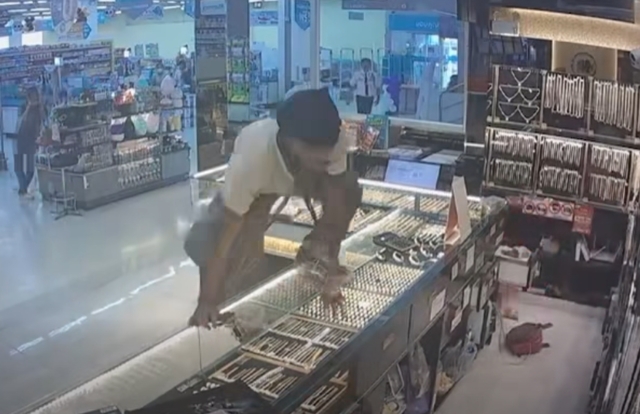 จากนั้นคนร้ายได้วิ่งกระโดดขึ้นเคาน์เตอร์ร้านทองแล้วลงไปกวาดสร้อยคอทองคำที่อยู่ในถาด ซึ่งใช้เวลาไม่นาน ก่อนวิ่งหลบหนีไป