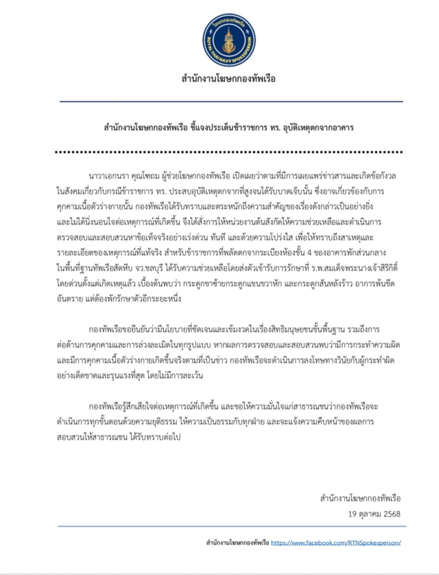 นาวาเอกนรา คุณโฑถม ผู้ช่วยโฆษกกองทัพเรือ เปิดเผยว่าตามที่มีการเผยแพร่ข่าวสารและเกิดข้อกังวลในสังคมเกี่ยวกับกรณีข้าราชการ ทร. ประสบอุบัติเหตุตกจากที่สูงจนได้รับบาดเจ็บนั้น ซึ่งอาจเกี่ยวข้องกับการคุกคามเนื้อตัวร่างกายนั้น กองทัพเรือได้รับทราบและตระหนักถึงความสำคัญของเรื่องดังกล่าวเป็นอย่างยิ่ง และไม่ได้นิ่งนอนใจต่อเหตุการณ์ที่เกิดขึ้น จึงได้สั่งการให้หน่วยงานต้นสังกัดให้ความช่วยเหลือและดำเนินการตรวจสอบและสอบสวนหาข้อเท็จจริงอย่างเร่งด่วน ทันที และด้วยความโปร่งใส เพื่อให้ทราบถึงสาเหตุและรายละเอียดของเหตุการณ์ที่แท้จริง สำหรับข้าราชการที่พลัดตกจากระเบียงห้องชั้น 4 ของอาคารพักส่วนกลาง ในพื้นที่ฐานทัพเรือสัตหีบ จ.ชลบุรี ได้รับความช่วยเหลือโดยส่งตัวเข้ารับการรักษาที่ ร.พ.สมเด็จพระนางเจ้าสิริกิติ์ โดยด่วนตั้งแต่เกิดเหตุแล้ว เบื้องต้นพบว่า กระดูกขาซ้ายกระดูกแขนขวาหัก และกระดูกสันหลังร้าว อาการพ้นขีดอันตราย แต่ต้องพักรักษาตัวอีกระยะหนึ่ง