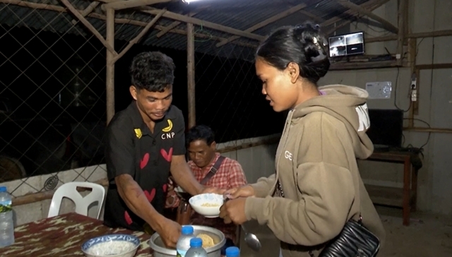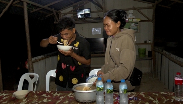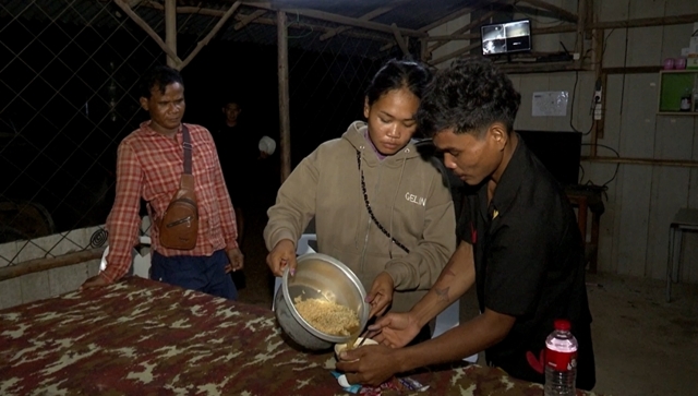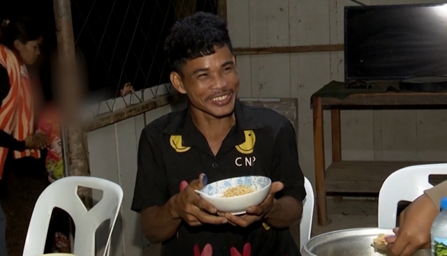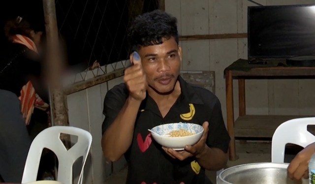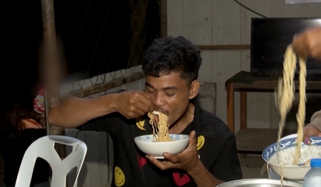 โดยกลุ่มแรงงานกัมพูชาทั้งหมดนั่งรวมกัน กินบะหมี่กึ่งสำเร็จรูปต้มอร่อยๆ พร้อมยกนิ้วโป้งให้