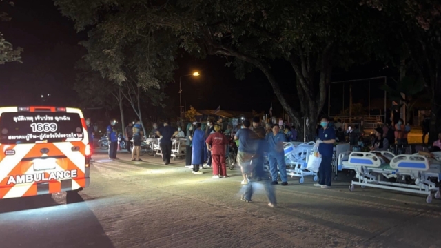 ท่ามกลางแสงสว่างที่ส่องจากรถยนต์ของญาติที่ช่วยกันเปิดไฟหน้าและส่องเข้าไปยังภายในตัวอาคาร รวมทั้งเครื่องปั่นไฟขนาดเล็กของอาสากู้ภัย