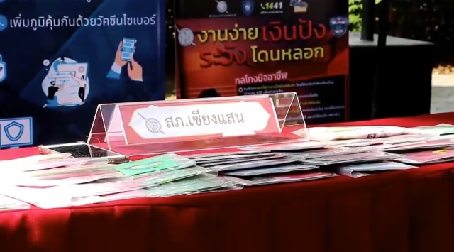 อีกราย เจ้าหน้าที่ตำรวจ สภ.เชียงแสน ได้รับแจ้งจากสายลับว่าจะมีการลักลอบส่งสมุดบัญชี บัตรอิเล็กทรอนิกส์ และซิมการ์ด ผ่านบริษัทขนส่ง เอกชน เพื่อส่งต่อไปประเทศลาว โดยฝากไว้ที่จุดฝากรถหน้าด่านสามเหลี่ยมทองคำ อ.เชียงแสน จ.เชียงราย ตำรวจจึงวาง กำลังซุ่มตรวจ จนพบรถขนส่งบริษัทเอกชน นำพัสดุมาส่ง มีชายชื่อ นายรุ่งโรจน์ รับพัสดุไป เจ้าหน้าที่จึงแสดงตัวตรวจ ค้น พบของกลางเป็นสมุดบัญชี บัตรอิเล็กทรอนิกส์ และซิมการ์ดจำนวนมาก ต่อมาวันที่ 21–22 ต.ค. 2568 เจ้าหน้าที่ขยายผลตรวจยึดพัสดุเพิ่มเติมจากบริษัทเอกชนในพื้นที่ พบของกลางลักษณะ เดียวกันหลายรายการ