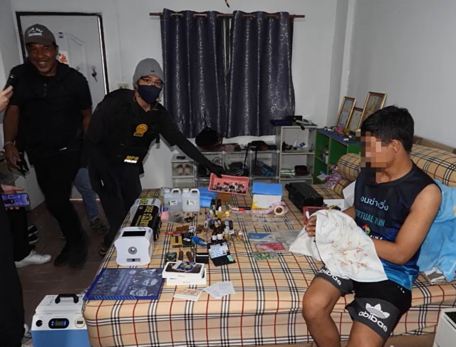 ซึ่งได้สืบสวนขยายผลจนทราบแหล่งที่มา ต่อมาวันนี้ (29 ต.ค. 68) เวลา 07.30 น. พล.ต.ต.ธีรเดชฯ ได้นำกำลังเจ้าหน้าที่ ศอ.ปส.บช.น., บก.สส.บช.น. และ กก.สส.บก.น.5 เข้าตรวจค้นห้องพัก ซ.อ่อนนุช 53 แขวงประเวศ เขตประเวศ กรุงเทพฯ แต่เมื่อกำลังเจ้าหน้าที่ไปถึงพบว่าคนร้ายในห้องพักไม่เปิดประตู จึงได้ถีบประตูเข้าไปตรวจสอบ เมื่อเข้ามาในห้องกลับไม่พบใครแต่พบว่าประตูห้องน้ำปิดอยู่ สัญชาตญาณชุดสืบสวนวิ่งเสริมแรงถีบประตูเข้าไปในห้องน้ำอย่างเต็มกำลัง พบตัว นาย ภาคภูมิ หรือ อาร์ม แอบเทยาเสพติดลงชักโครกอยู่ในห้องน้ำ จึงได้ควบคุมตัวไว้ ซึ่งจากการตรวจค้นห้องพักพบของกลาง หัวเชื้อผสมอาหาร และวัตถุดิบผสมหัวบุหรี่ไฟฟ้า , อุปกรณ์แพ็คส่ง, เครื่องซีน และเคตามีน เป็นจำนวนมาก