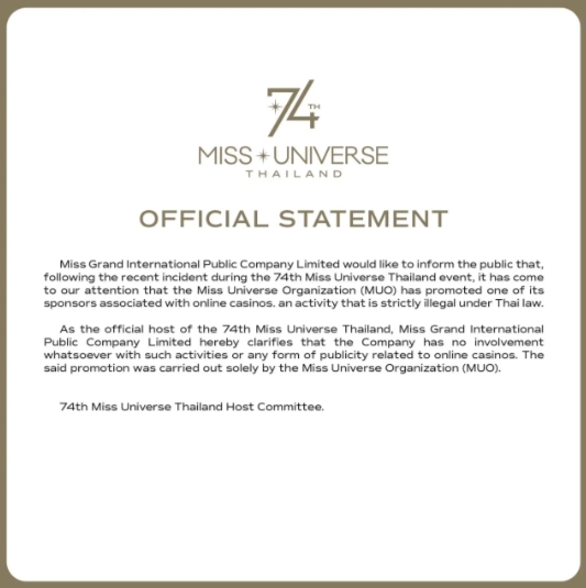 บริษัท มิสแกรนด์ อินเตอร์เนชั่นแนล จำกัด (มหาชน) ขอแจ้งให้สาธารณชนทราบว่า ภายหลังเหตุการณ์ที่เกิดขึ้นในงานการประกวดมิสยูนิเวิร์สไทยแลนด์ ครั้งที่ 74 ทางบริษัทได้รับทราบว่ามีการเผยแพร่สปอนเซอร์รายหนึ่งขององค์กร Miss Universe Organization (MUO) ซึ่งเกี่ยวข้องกับคาสิโนออนไลน์ — ซึ่งเป็นกิจกรรมที่ผิดกฎหมายโดยชัดเจนตามกฎหมายไทย