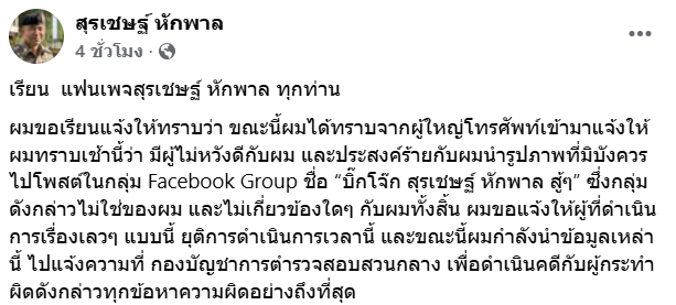"ผมขอเรียนแจ้งให้ทราบว่า ขณะนี้ผมได้ทราบจากผู้ใหญ่โทรศัพท์เข้ามาแจ้งให้ผมทราบเช้านี้ว่า มีผู้ไม่หวังดีกับผม และประสงค์ร้ายกับผมนำรูปภาพที่มิบังควรไปโพสต์ในกลุ่ม Facebook Group ชื่อ "บิ๊กโจ๊ก สุรเชษฐ์ หักพาล สู้ๆ" ซึ่งกลุ่มดังกล่าวไม่ใช่ของผม และไม่เกี่ยวข้องใดๆ กับผมทั้งสิ้น ผมขอแจ้งให้ผู้ที่ดำเนินการเรื่องเลวๆ แบบนี้ ยุติการดำเนินการเวลานี้ และขณะนี้ผมกำลังนำข้อมูลเหล่านี้ ไปแจ้งความที่ กองบัญชาการตำรวจสอบสวนกลาง เพื่อดำเนินคดีกับผู้กระทำผิดดังกล่าวทุกข้อหาความผิดอย่างถึงที่สุด"