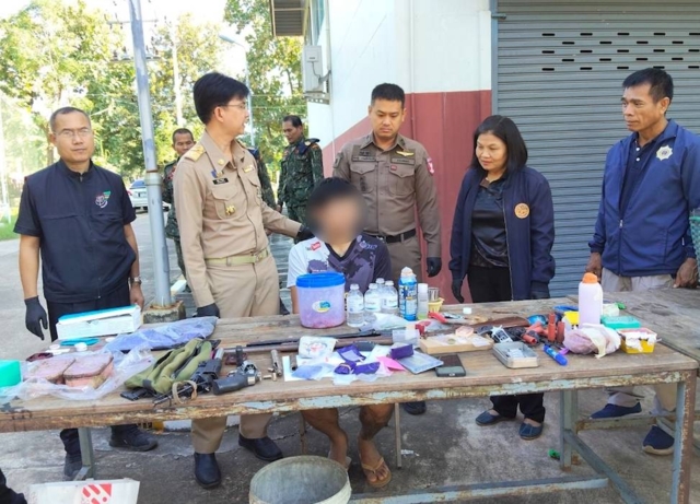 จากการตรวจค้นพบอุปกรณ์การผลิตยาบ้า โดยนำอุปกรณ์ทำบาร์บีคิวมาดัดแปลงจำนวนหลายชิ้น โดยส่วนผสมสำหรับทำยาบ้า ประกอบด้วยยาพารา หมึกปากกาสีแดง ผงแต่งกลิ่นรสวนิลา ยาบ้ารวม 601 เม็ด อาวุธปืนสั้นไทยประดิษฐ์ 2 กระบอก และอาวุธปืนแก็ปยาวไทยประดิษฐ์ 1 กระบอก ก่อนควบคุมตัวมาสอบสวนที่สภ.เขาสวนกวาง