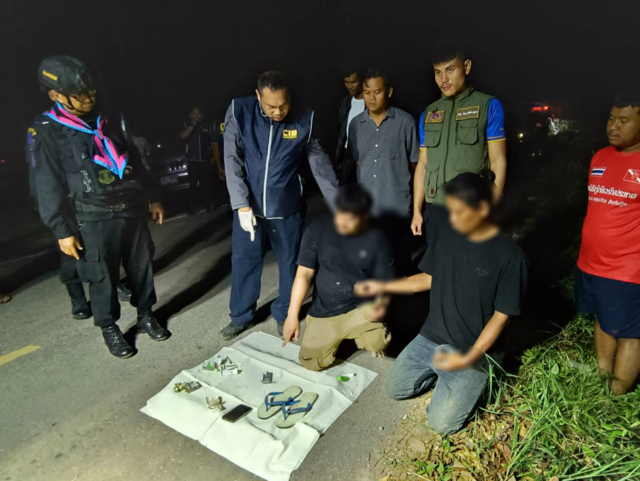 ภายในมีชายไทยสองคนกำลังขนถุงตาข่ายสีฟ้าลงจากรถ แต่เมื่อเห็นเจ้าหน้าที่ทั้งคู่รีบขึ้นรถหลบหนี ทำให้เจ้าหน้าที่ต้องเร่งไล่ติดตามอย่างกระชั้นชิด จนสามารถติดตามรถคันดังกล่าวได้ที่บริเวณบ้านเขาน้อย ต.คลองน้ำใส ซึ่งผู้ต้องหาทั้งสองคน ได้แก่ นายสุวัฒน์ และนายสืบพงษ์ ตัดสินใจทิ้งรถ และวิ่งหนีเข้าป่า ก่อนกระโดดลงสระน้ำหวังหลบหนี แต่ถูกเจ้าหน้าที่ติดตามจับกุมได้ทันควัน