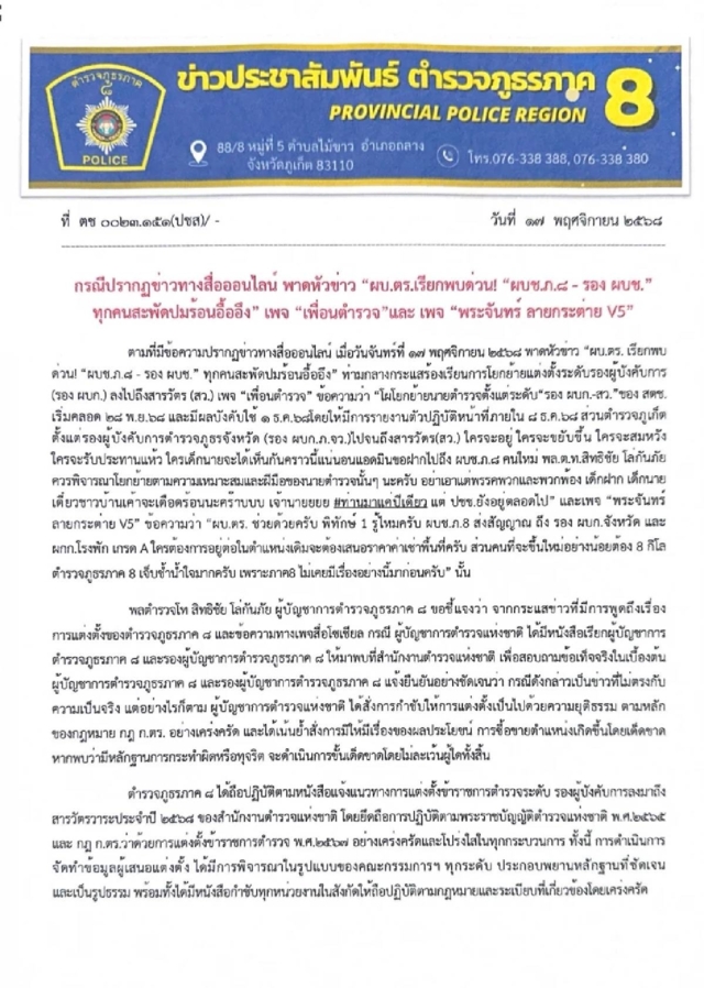 ตามที่มีข้อความปรากฏข่าวทางสื่อออนไลน์ เมื่อวันจันทร์ที่ 17 พ.ย. 2568 พาดหัวข่าว ผบ.ตร. เรียกพบด่วน! ผบช.ภ.8 – รอง ผบช. ทุกคนสะพัดปมร้อนอื้ออึง ท่ามกลางกระแสร้องเรียนการโยกย้ายแต่งตั้งระดับรองผู้บังคับการ(รอง ผบก.) ลงไปถึงสารวัตร (สว.)