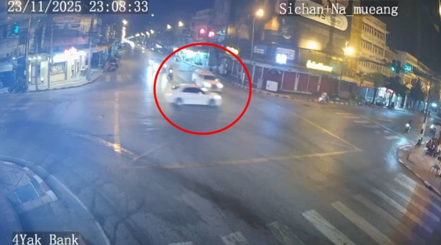 (24 พ.ย. 2568) ภาพจากกล้องวงจรปิดแยกถนนหน้าเมืองตัดถนนศรีจันทร์ สามารถบันทึกภาพขณะที่รถยนต์กระบะสีขาว ทะเบียนกรุงเทพมหานคร ขับมาบนถนนกลางเมืองฝ่าสัญญาณไฟแดง พุ่งชนกับรถยนต์โตโยต้าวีออส สีขาว ทะเบียนขอนแก่น ที่ขับมาบนถนนศรีจันทร์ตามสัญญาณไฟเขียว ทำให้รถกระบะเสียหลักพุ่งเข้าชน ร้านนมสด ที่มีลูกค้านั่งอยู่หน้าร้าน โดยเหตุการณ์เกิดขึ้นเมื่อเวลา 23.08 น. วันที่ 23 พ.ย. 2568 ที่ผ่านมา