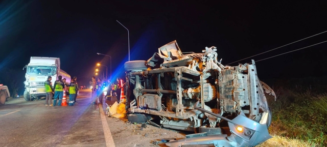 เวลา 22.00 น. (3 ธ.ค. 2568) เกิดอุบัติเหตุบนถนนหมายเลข 11 ระหว่างหลักกิโลเมตรที่ 48-49 ถนนตากฟ้า-ท่าตะโก เนินเขาผาลาดบ้านพุขาม ต.หนองหลวง อ.ท่าตะโก จ.นครสวรรค์ ในที่เกิดเหตุพบรถเทเลอร์บรรทุกน้ำมันสีขาวจอดอยู่กลางถนนฝั่งขาล่อง ริมถนนฝั่งซ้ายขาขึ้น พบรถบรรทุกพ่วงตกถนนอยู่ 2 คัน บาดเจ็บ 3 คน ชาย 2 หญิง 1 ฝั่งตรงข้ามขาล่องพบรถตู้โดยสารสีบอร์น ด้านหน้าพังเสียหาย มีผู้บาดเจ็บเป็นชาย 1 ราย