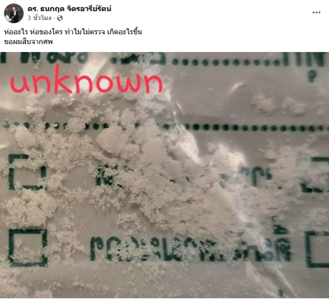 พร้อมกับโพสต์ภาพ ซองบรรจุผงสีขาว ระบุข้อความว่า “ห่ออะไร ห่อของใคร ทำไมไม่ตรวจ เกิดอะไรขึ้น ขอผมสืบจากศพ”