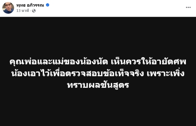 ล่าสุด “พุทธ อภิวรรณ” ผู้ประกาศข่าวชื่อดัง โพสต์ข้อความระบุว่า “คุณพ่อและแม่ของน้องนัด เห็นควรให้อายัดศพน้องเอาไว้ เพื่อตรวจสอบข้อเท็จจริง เพราะเพิ่งทราบผลชันสูตร”