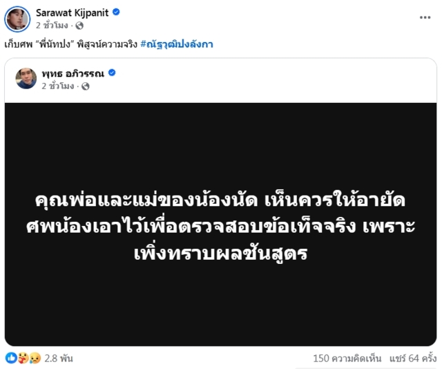 ล่าสุด ไอซ์ สารวัตร กิจพานิช ผู้ประกาศข่าวชื่อดัง ได้แชร์ข้อความของ “พุทธ อภิวรรณ” พร้อมระบุข้อความว่า เก็บศพ “พี่นัทปง” พิสูจน์ความจริง #ณัฐวุฒิปงลังกา