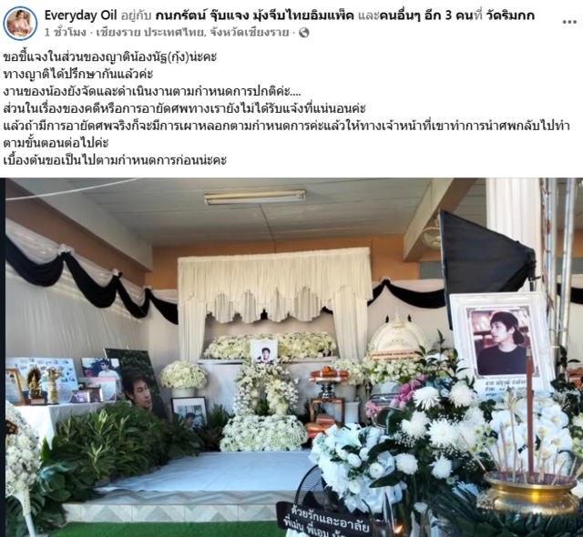 ล่าสุดเฟซบุ๊ก “Everyday Oil” ได้โพสต์ชี้แจงว่า “ขอชี้แจงในส่วนของญาติน้องนัฐ(กุ้ง)น่ะคะ ทางญาติได้ปรึกษากันแล้วค่ะ งานของน้องยังจัดและดำเนินงานตามกำหนดการปกติค่ะ ส่วนในเรื่องของคดีหรือการอายัดศพทางเรายังไม่ได้รับแจ้งที่แน่นอนค่ะ แล้วถ้ามีการอายัดศพจริงก็จะมีการเผาหลอกตามกำหนดการค่ะแล้วให้ทางเจ้าหน้าที่เขาทำการนำศพกลับไปทำตามขั้นตอนต่อไปค่ะ เบื้องต้นขอเป็นไปตามกำหนดการก่อนน่ะคะ”