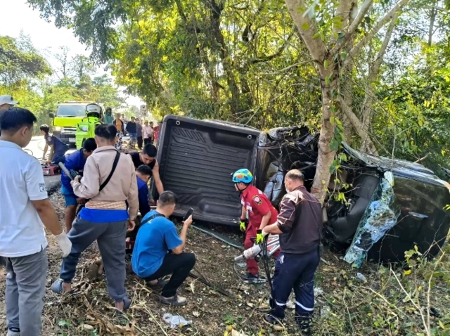 ที่เกิดเหตุพบรถกระบะ 4 ประตูสีดำ ทะเบียนกง 3894 หนองคาย เสียหลักชนกับต้นไม้ใหญ่ข้างทางฝั่งมุ่งหน้าไป อ.พิบูลย์รักษ์ หลังคายุบพังเสียหายทั้งคัน ที่เบาะที่นั่งคนขับพบศพนางอภิญญา อายุ 55 ปี สภาพคอหักเสียชีวิตและมีพบผู้บาดเจ็บ 6 คน ทั้งหมดยังไม่สามารถให้การได้