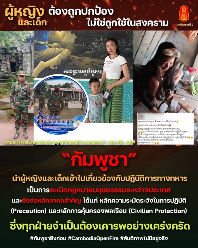 กัมพูชาสิ้นเกียรติภูมิ! ใช้พลเรือนเป็นโล่มนุษย์ ภาพหลักฐานว่อน ผัวยิง เมียบรรจุกระสุนปืนค. ลูกน้อยไร้เดียงสาอยู่ข้างๆ ไทยประณาม ละเมิดร้ายแรง กฎหมายมนุษยธรรมระหว่างประเทศและขัดต่อหลักสากลสำคัญ ได้แก่ หลักความระมัดระวังในการปฏิบัติ (Precaution) และหลักการคุ้มครองพลเรือน (Civilian Protection) ซึ่งทุกฝ่ายจำเป็นต้องเคารพอย่างเคร่งครัด