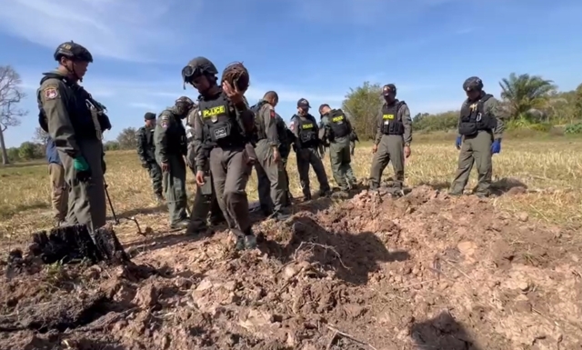 เมื่อวันที่ 29 ธ.ค.68 พ.ต.ท.จารุบุตร เรืองศรี รองผกก.ตชด.22 นำกำลังเจ้าหน้าที่ชุด EOD กก.ตชด.22 ร่วมกับชุดEOD ตำรวจภูธรธรจังหวัดศรีสะเกษ และเจ้าหน้ามี่ทหาร ได้ร่วมกันตรวจสอบร่องรอยหลุมลูกจรวดBM-21 และลูกปืนใหญ่ลูกปืน 100 ปรส. ที่ฝ่ายทหารกัมพูชายิงมาตกในหมู่บ้านชายแดน ต.เสาธงชัย