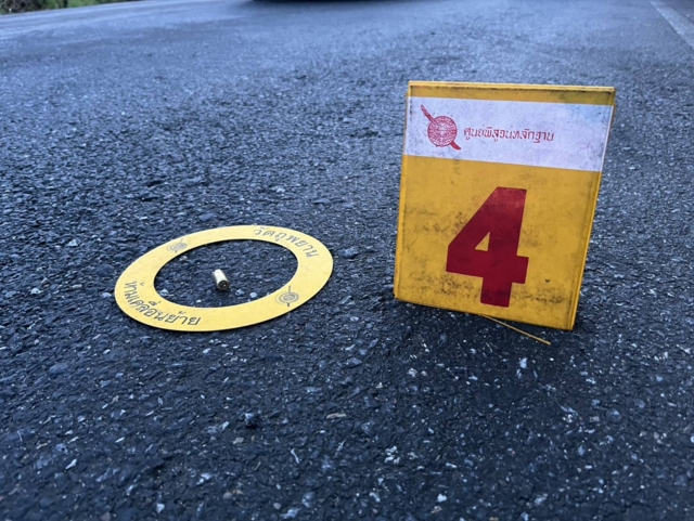 ใกล้กันพบรถจักรยานยนต์ของผู้ตายล้มอยู่ และพบปลอกกระสุน 9 มม. 2 ปลอก เจ้าหน้าที่เก็บไว้เป็นหลักฐาน