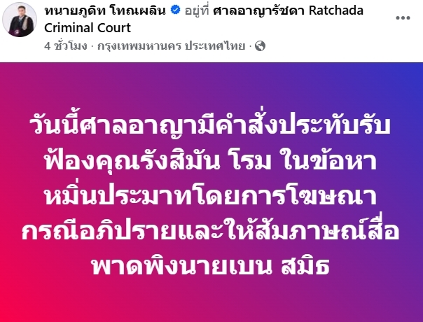 ล่าสุด นายภูดิท โทณผลิน ทนายความ โพสต์เฟซบุ๊กส่วนตัว ระบุข้อความว่า “วันนี้ศาลอาญามีคำสั่งประทับรับฟ้องคุณรังสิมันต์ โรม ในข้อหาหมิ่นประมาทโดยการโฆษณา กรณีอภิปรายและให้สัมภาษณ์สื่อพาดพิงนายเบน สมิธ”
