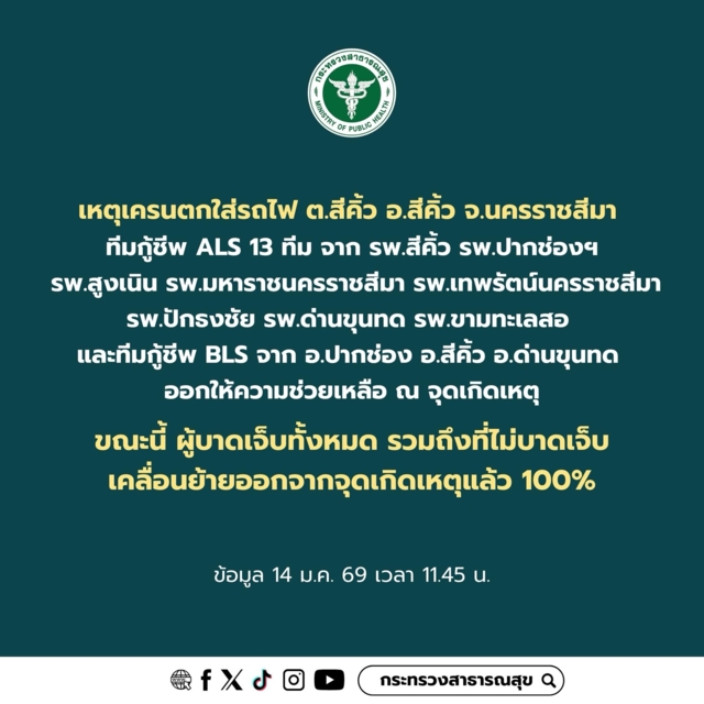 ล่าสุดกระทรวงสาธารณสุข ระบุว่า เหตุเครนตกใส่รถไฟ ต.สีคิ้ว อ.สีคิ้ว จ.นครราชสีมา
