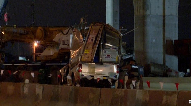 โดยเจ้าหน้าที่ได้มีการระดมนำรถเครนหลายคัน เพื่อเตรียมความพร้อม และกำลังยกโครงเหล็ก รวมถึงแท่นปูนออกจากรถกระบะ ซึ่งตอนนี้ยังไม่สามารถนำร่างออกมาได้ เนื่องจากถูกโครงเหล็กรวมถึงแท่นปูนทับไว้