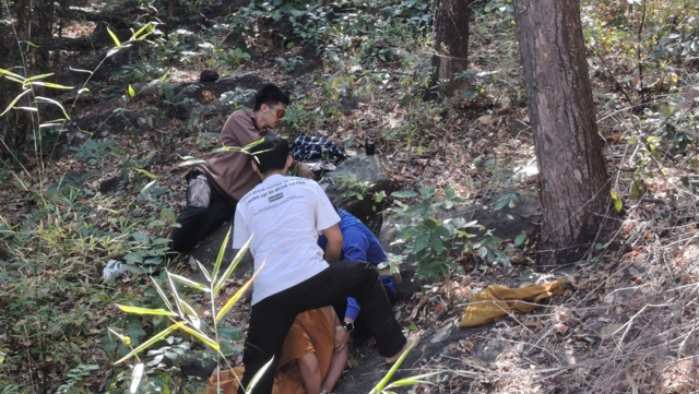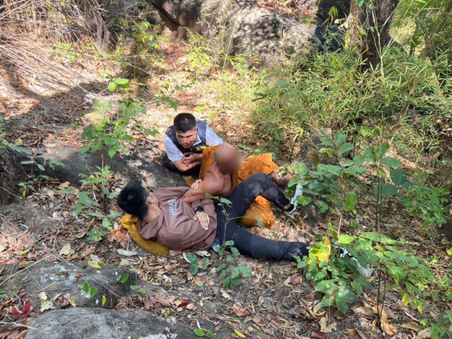 ต่อมา ผู้ต้องหาได้ ใช้อุบายขอขึ้นไปบนภูเขาเพื่อกราบพระพุทธรูป โดยอ้างว่ายังไม่ได้ดำเนินการลาสิกขาให้แล้วเสร็จ ระหว่างที่อยู่บนภูเขา ผู้ต้องหาได้ฉวยโอกาส กระโดดลงจากหน้าผา ลึกกว่า 4 เมตร และวิ่งหลบหนีไปตามสันเขา เป็นระยะทางประมาณ 500 เมตร เจ้าหน้าที่ตำรวจจึงได้ติดตามอย่างกระชั้นชิด และสามารถจับกุมตัวผู้ต้องหาได้ และเนื่องจาก บริเวณพื้นที่จับกุมเป็นทางลาดชันและเป็นทางภูเขาสลับซับซ้อน ในระหว่างการปฏิบัติหน้าที่ มีเจ้าหน้าที่ตำรวจได้รับบาดเจ็บจากการติดตามจับกุมตัวผู้ต้องหา จนภารกิจสำเร็จลุล่วง